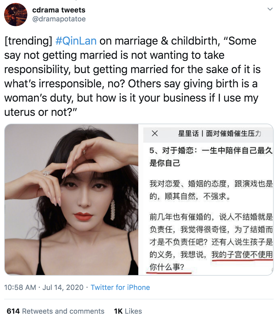 Does a woman have to give birth? That’s what 1.4 million people were discussing on Chinese social media this week after a clapback by a famous actress. Qin Lan, who’s perhaps best known for her role in the hit TV drama Story of Yanxi Palace, said in an interview: “People have been asking me why I’m not getting married, and some have even suggested it’s ‘irresponsible’ if I don’t have a baby. I think it’s strange. “What’s it to you if I use my uterus or not?” That line went viral and became its own hashtag on Weibo, the Chinese equivalent of Twitter. The 38-year-old actress’s remarks struck a chord with many women, who struggle to deal with conservative values in a rapidly modernizing Chinese society. Chinese women who are single beyond their 20s continue to be derided as “leftover” women—unwanted and therefore of seemingly lower value.